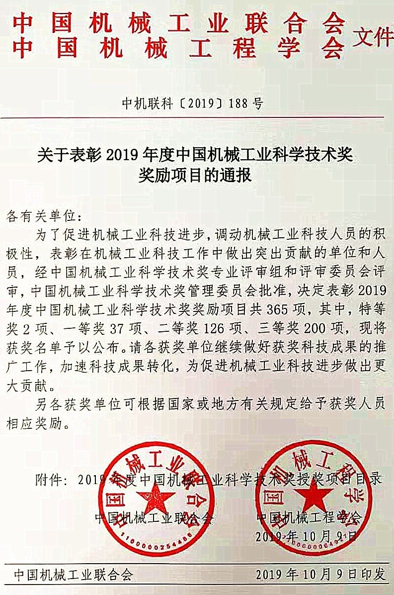 熱烈慶祝我司榮獲2019年中國機械工業(yè)科技進步獎特等獎