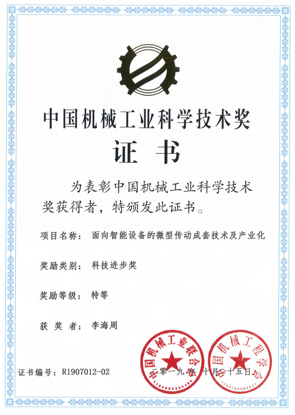 2019年10月11日,中國機械工程學會官網(wǎng)發(fā)布了《關于表彰2019年度中國機械工業(yè)科學技術獎獎勵項目的通報》,其中我司與北京工業(yè)大學、深圳市密姆科技有限公司聯(lián)合開展的項目---面向智能設備的微型傳動成套技術及產(chǎn)業(yè)化,榮獲科技進步獎特等獎(證書編號 R1907012-02 頒獎信息:2019年度中國機械工業(yè)科學技術獎頒獎大會 http://www.cmiao.com.cn/cms/news/773.htm)。